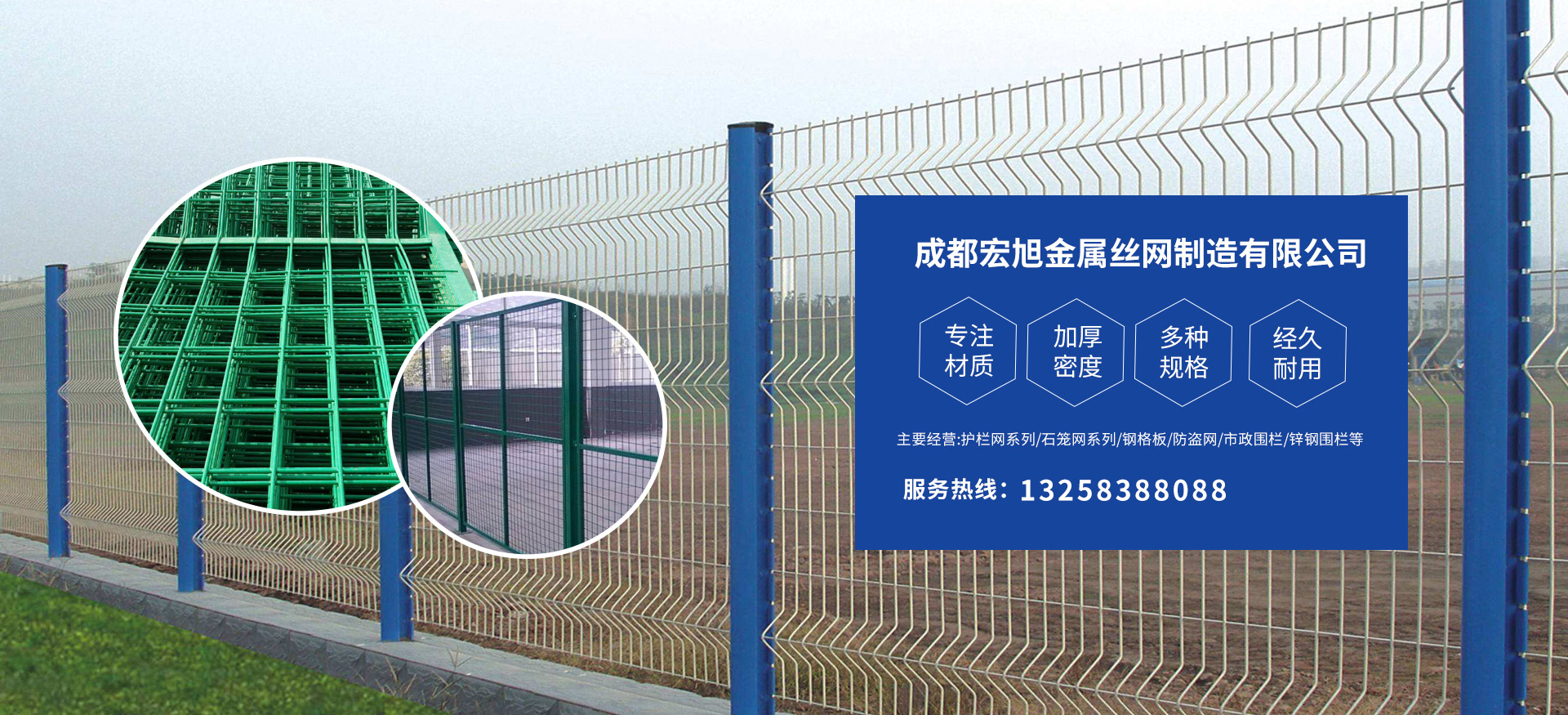 成都宏旭金屬絲網(wǎng)制造有限公司主營護欄網(wǎng)系列、石籠網(wǎng)系列、鋼格板、防盜網(wǎng)、市政圍欄、鋅鋼圍欄、鋼筋網(wǎng)片、聲屏障系列、波形護欄板、柔性纜索護欄、SNS邊坡防護網(wǎng)等其他絲網(wǎng)類產(chǎn)品。特殊規(guī)格可加工定做,也可根據(jù)客戶來圖來樣定做。自創(chuàng)業(yè)以來,公司一直堅持市場為導向,以客戶為根本,以實業(yè)為基礎,以技術為支持,以科研為后盾,集科研、生產(chǎn)、經(jīng)營為一體,不斷研制開發(fā)新產(chǎn)品,開拓市場,走綜合發(fā)展之路。多年來,公司憑借過硬的質(zhì)量,良好的信譽、優(yōu)質(zhì)的服務、合理的價格,贏得了市場和商家的一致好評。